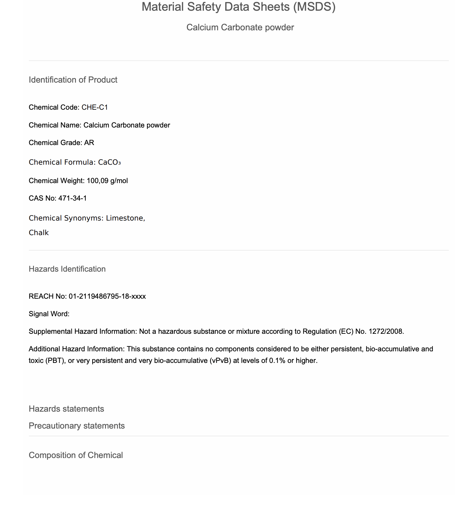 Chemical Name: Calcium Carbonate powder